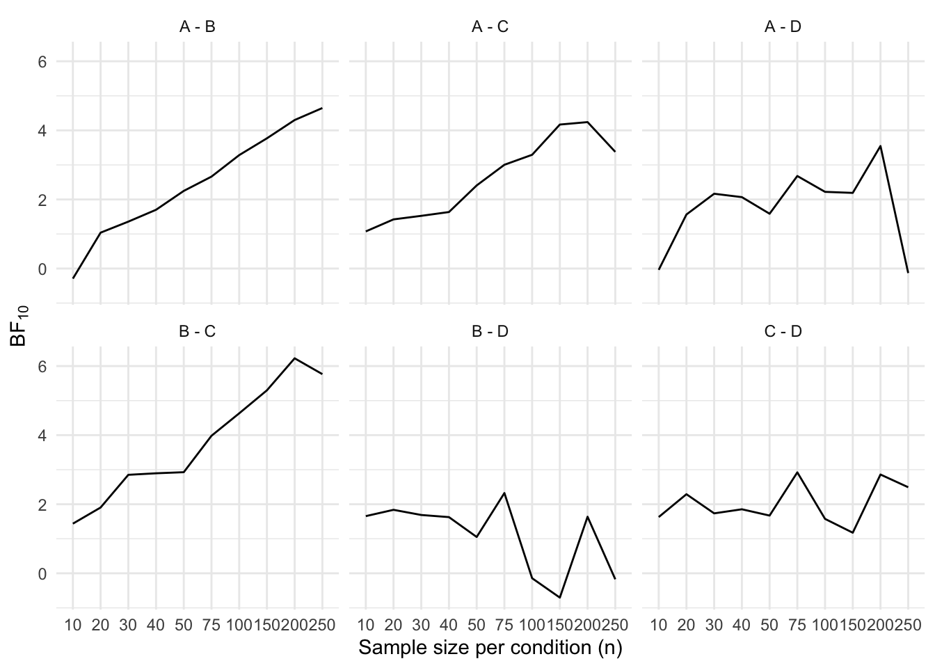 Below I use both `brms` and `BayesFactor` to calculate Bayes factors for the effect of condition across various sample sizes.